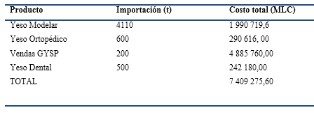 Se debe adicionar también el ahorro de unos $7 500 000MLC, que obtendría el país por concepto de sustitución de importación de materia prima, así como de algunos de los productos que con ella se obtienen Tabla 2. Se evitaría la importante erogación de las divisas respectivas que realiza. Esto se consumaría a partir del momento en que se contara físicamente con la producción nacional de yesos especiales. Siendo estos los objetivos estratégicos a los que están convocados todos los factores y entidades del estado cubano.