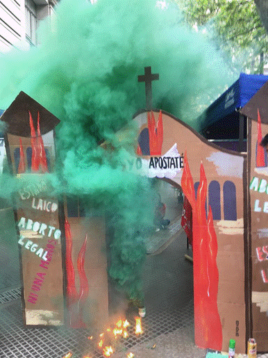 La Apostasía Colectiva Feminista para Decidir fue una acción organizada como respuesta al lobby de las Iglesias contra la legalización del aborto en 2018. Para esa acción produjimos la fachada de una iglesia en llamas literalizando la mítica cita de Piotr Kropotkin: “La única iglesia que ilumina es la que arde”. En esa fachada, hecha de cartón pintado, la gente se sacaba fotos luego de entregar su trámite de apostasía, donde también se entregaban estampitas profanas.