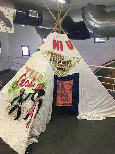 El Telo Lésbico es una carpa al estilo teepee, pintada a mano colectivamente con imágenes y consignas feministas, instalada en la Plaza del Congreso en la previa al Paro Internacional Feminista (en el día de la visibilidad lésbica) para que las compañeras pudieran tener sexo como parte de la celebración, erotizando la política y politizando el placer en una protesta sexual.