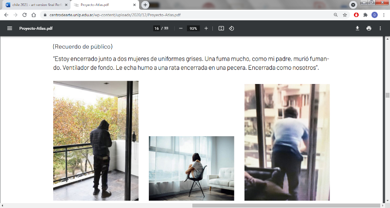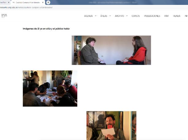 Si yo en silla y el público habla, realizada en los últimos meses del 2020, se plantea como un encuentro performativo en el que la directora hace de público y el que fue público de sus obras actúa frente a ella: “La acción parte de procedimientos de inversión, el público trabajando y devenido en obra y yo misma viviendo la experiencia de ser público de mis obras, de los residuos de mis obras en la memoria de algunos espectadores” (Proyecto Atlas, 24). Al comienzo se firma un contrato para formar una cooperativa, una referencia directa al mundo de Cuerpos abanderados, para gestionar el dinero que había para la actividad.