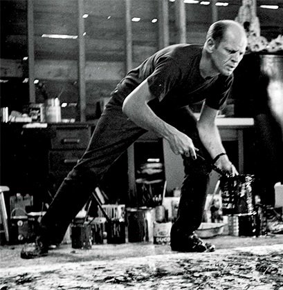 Una de las imágenes icónicas del archivo de la modernidad fueron las fotografías de Jackson Pollock que Hans Namuth hizo en 1950, pertenecientes a la Fundación Pollock-Krasner, de la que extraigo aquí la mitad de una de ellas, la correspondiente al artista, el que hace, el que actúa. Seguramente, la encontramos en algún lugar de nuestra memoria cultural, y si no, es fácil dar con ellas en ese archivo de archivos que es hoy internet. El pintor aparece en su taller con ropa de trabajo. Un año después se pondrá al aire libre en mitad de la naturaleza para la grabación del vídeo también de Hans Nammuth en 1951. Pero en estas primeras está todavía en el interior de su estudio, ligeramente inclinado sobre un gran lienzo dispuesto en el suelo. Se le ve concentrado, con un bote de pintura en una mano y un pincel grueso en la otra esparciendo pintura por uno y otro lado de la amplia superficie del cuadro. Está absorto en su tarea, aunque nos lo imaginamos algo tenso y por momentos nervioso. Dos antes, la revista Life le dedicó un reportaje firmado por Ben Cosgrove (1949) y acompañado con las imágenes de Martha Holmes, en el que se lanzaba la siguiente pregunta: “Is he the greatest living painter in the United States?”.