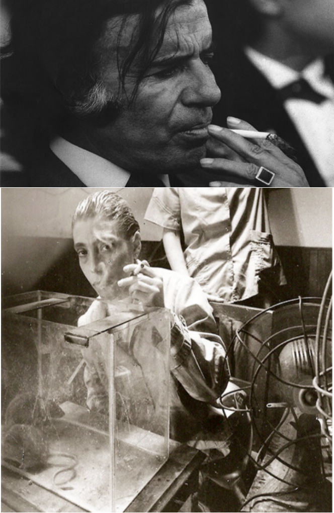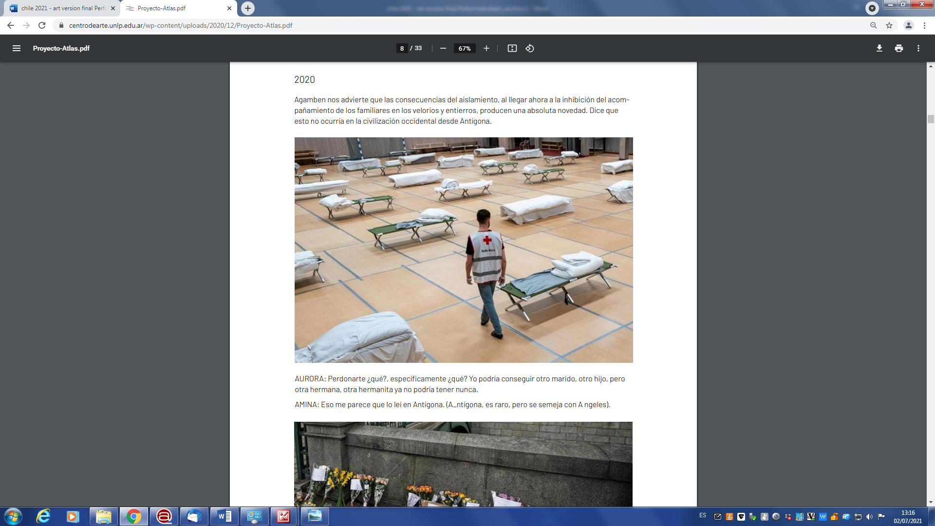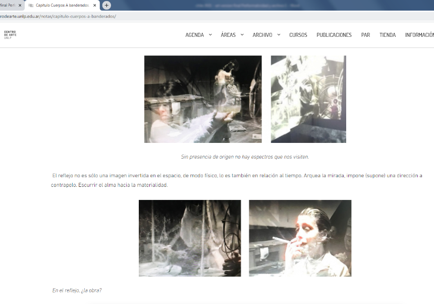 Las “imágenes comentadas”, que conforman el archivo de Cuerpos abanderados, una ficción dramática sobre una cooperativa en un pueblo de Buenos Aires en el que no se permite a las familias recuperar a sus muertos, se intercalan con imágenes y comentarios ligadas al momento político y cultural de entonces y de ahora, de lo que estaba pasando a finales de los años noventa y de lo que está pasando ahora. Así, por ejemplo, a la descripción de una escena de la obra en la que se ve a la actriz llevándose un cigarrillo a los labios, le sigue una foto de Carlos Saúl Menem, el que fuera presidente de Argentina, en el momento de hacerse público el indulto a los presidentes de la dictadura militar argentina llevándose igualmente un cigarrillo a los labios. O tras una referencia a la ficción dramática, en la que a los deudos de los muertos solo se les entrega una foto de estos, le sigue una imagen de las camas alineadas en los hospitales improvisados para atender a los enfermos de Covid, a la que sigue un comentario de Agamben sobre la situación, insólita desde los tiempos de Antígona, de que los familiares de los enfermos ingresados no puedan despedirse de ellos.