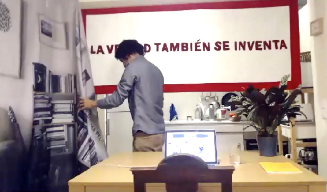 A diferencia de Pardo, quien durante el desarrollo de la pieza siempre habló en primer plano mirando a la pantalla, Rodríguez apareció en escena de espaldas al público, sentado frente a un escritorio donde se ubicaba su laptop, en un espacio que parecía ser un estudio, con un librero al fondo. El actor se puso de pie hacia la mitad de la obra para retirar lo que resultó ser una enorme fotografía del estudio de fondo, que se corría como cortina para revelar una cocina en la que estaba colgado un letrero en el que se leía con grandes letras rojas sobre fondo blanco: “LA VERDAD TAMBIÉN SE INVENTA” (ver Imagen 4)[17].