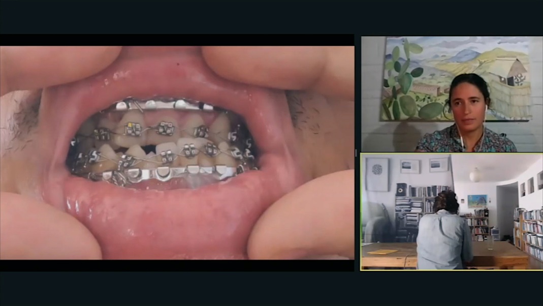 En Lázaro el relato fue construido mediante “secuencias de conducta” (Schechner 2011, p. 35) tanto biográficas como teatrales y cinematográficas. Como espectadores vemos todo a través de una multiplicidad de lentes organizados por la dramaturgia de los creadores y mediados por la sala de videoconferencias. Nuestra mirada, deseosa de aprehender aquello que realmente le pasó al rostro de Gabino, se topa de golpe con imágenes en primerísimo plano de sus dientes operados, sus ojos irritados, sus injertos de cabello (ver Imagen 6). La cámara invade el cuerpo del performer y, gracias a ella, nuestra mirada se introduce en él como la mano del cirujano imaginada por Benjamin.