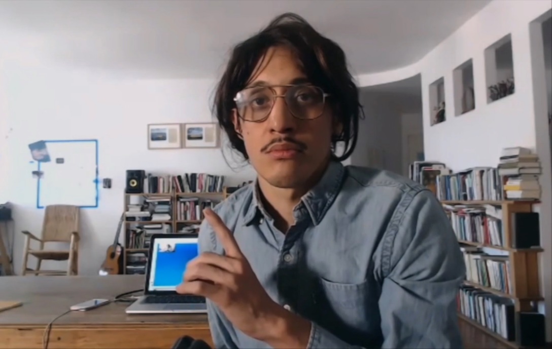 En la escena final, no obstante, se produjo una inversión de miradas. Lázaro se levantó del escritorio y se dirigió al fondo de la cocina, retiró el pendón con la frase de Machado y abrió la puerta del gabinete sobre el fregadero. Detrás de esa puerta se filtró una potente luz, sugiriendo una ventana que dejaba entrar los rayos del sol. Enseguida, Lázaro volteó lentamente su cuerpo y rostro hacia la cámara, siguiendo el ritmo de un melancólico tema musical. Usaba anteojos de alambre estilo vintage y lucía un delgado bigote. Se desplazó lentamente hacia la cámara, haciendo dos o tres pausas para adoptar distintas poses (ver Imagen 7). Finalmente, se sentó frente a la pantalla, pasando del medio al primer plano y realizando nuevas poses para terminar con el rostro casi pegado a la lente, creando una toma de incómoda cercanía a sus ojos que devolvían nuestra mirada, escudriñando al público voyerista.