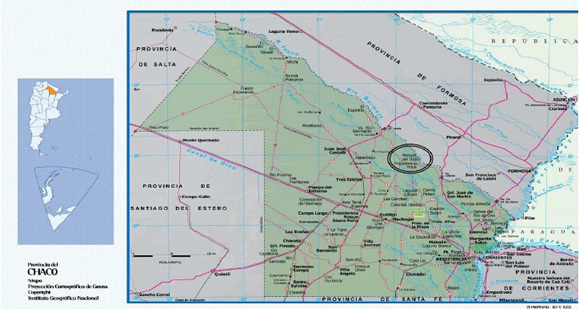 En este mapa, perteneciente a la provincia de Chaco, se puede ubicar a la Localidad de Pampa del Indio dentro del círculo negro. Fuente: Instituto Geográfico Nacional.