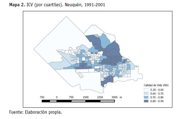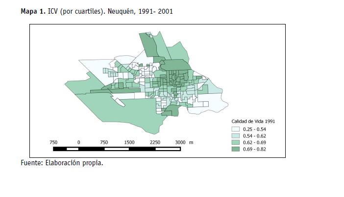 Aunque relevantes en el estudio de la calidad de vida, el ICV global presenta un inocultable problema: con su concurso podemos saber a ciencia cierta la performance de la ciudad en materia de bienestar, pero no nos permite conocer cuáles fueron las áreas que mostraron un mayor o peor desempeño en tal rubro. Es decir, no podemos dar cuenta del patrón de segregación que presentaba la capital provincial y, menos aún, dialogar con la literatura que ha analizado la estructuración socio-espacial de las urbes latinoamericanas. De ahí la importancia de representar cartográficamente el valor del ICV de cada uno de los radios que dieron vida a la ciudad de Neuquén en el periodo que nos ocupa: si para 1991 estamos hablando de un total de 186; diez años después esa cantidad se había deslizado hasta 223. Realizar un estudio intraurbano nos permitirá visualizar cuáles fueron las áreas perjudicadas y beneficiadas por la “gran transformación”, pero también realizar una taxonomía de aquellas áreas que presentaban similitudes en materia educativa, sanitaria, habitacional y ambiental.