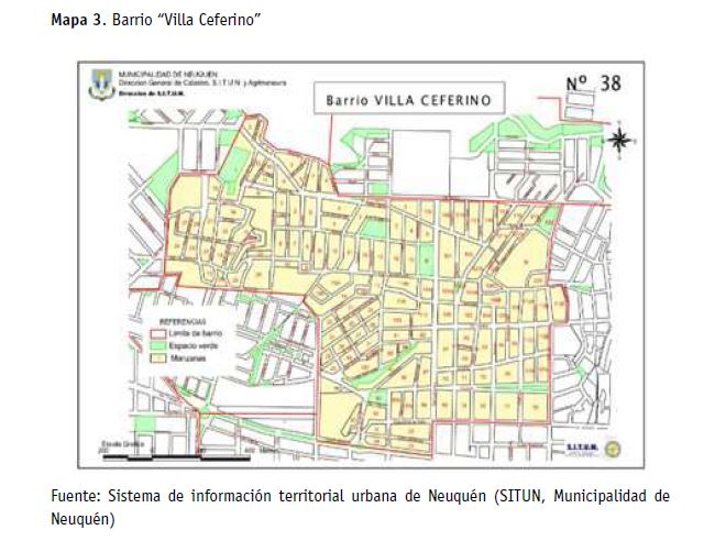 Este ejercicio de articulación escalar no estaría completo sin la utilización de una lente más poderosa, una que nos permita observar la textura de un área que a priori se nos presentaba uniforme. Esta apuesta por el microanálisis se volverá operativa a través del estudio de una de las islas que formaban el “archipiélago de la pobreza”: Villa Ceferino, en el cuadrante noroccidental de la ciudad. La ocupación de ese territorio se remonta a 1973, cuando comenzaron una serie de asentamientos sucesivos de población en tierras baldías propiedad del municipio y de la provincia de Neuquén, formalmente bajo jurisdicción del Barrio Progreso3. Aunque la parte más antigua era conocida como Villa Oeste, una ermita levantada en honor a Ceferino Namuncurá terminó por aglutinar, al menos nominalmente, a un territorio mayor que abarcaba diferentes sectores y distintos momentos de ocupación. Su geografía compleja y sus calles de trazado irregular tienen su explicación en esta superposición de límites, en un espacio ganado a la meseta, aunque de forma desorganizada. Sin que mediaran disposiciones o reglamentaciones oficiales, el barrio fue expandiéndose hasta concentrar a mediados de la década de 1990 a más de 13.500 habitantes en quince sectores diferentes4 de los cuales sólo dos respondían a un proceso de cesión de tierras y construcción de viviendas propiciado por el Estado5 (Mapa 3).