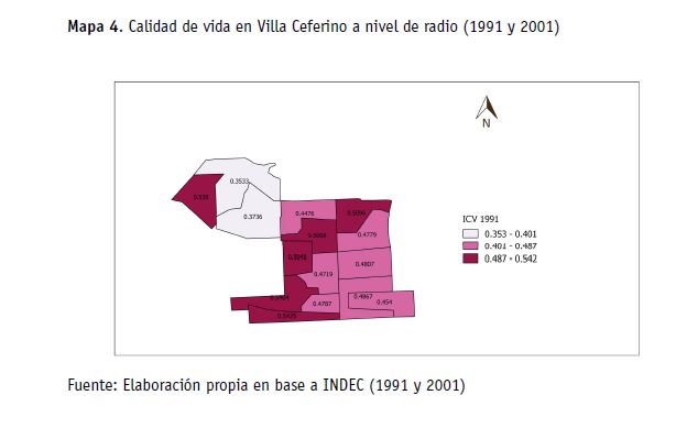 Si hiciéramos zoom sobre el área estudiada, encontraríamos algunas desigualdades, que resultaban invisibles en una mirada panorámica. Lejos de ser un espacio homogéneo, Villa Ceferino evidenciaba una profunda brecha en materia de bienestar, que no hizo más que incrementarse a lo largo de la “gran transformación neoliberal”. Para dar cuenta de ello detengámonos un instante en los valores extremos que el ICV registró en los radios que corresponden al barrio: en 1991, el valor máximo era un 45% superior al valor mínimo; diez años después, esa proporción había trepado al 57%. Lo mismo advertiríamos si hiciéramos el ejercicio inverso: si a principios de la década de 1990, el valor mínimo representaba un 68% del máximo, en 2001, ese porcentaje retrocedió hasta ubicarse en 63. Lo que observamos en Villa Ceferino no deja de ser interesante: el proceso de neoliberalización no sólo profundizó el abismo que separaba a las áreas que conformaban la ciudad, sino también intensificó las desigualdades al interior de un asentamiento que, desde la década de 1980, presentaba un rezago en materia de calidad de vida (Mapas 4 y 5).