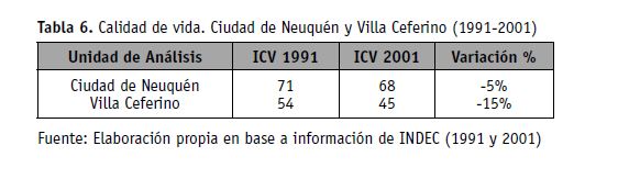 Una manera de sistematizar el análisis del impacto que la “gran transformación” neoliberal tuvo para la década del 90 es echando un vistazo al comportamiento de la calidad de vida. Cuando relevamos, en la sección anterior, lo que sucedía a escala ciudad, observábamos el tránsito desde una cifra cercana a 71 a una levemente superior a 68. Un análisis sobre el comportamiento del indicador, con el mismo recorte temporal, pero haciendo foco en Villa Ceferino, nos dirá que aquí también se experimentó una caída, aunque bastante más significativa: en diez años pasó de cerca de 54 a poco más de 45. Es decir que, mientras la calidad de vida en Neuquén empeoró un 5%, la de los vecinos de este barrio del noroeste de la ciudad lo hizo en un 15%. En palabras de Landriscini y Dommett (2016), el proceso de neoliberalización había acentuado un cuadro de segregación “con impactos diversos en la calidad de vida de la población”, con áreas en las que se observaban inocultables faltantes en materia de infraestructura y sectores en los que la tónica pareciera responder “a la demanda de sectores de altos ingresos con residencia en la región” (Tabla 6).