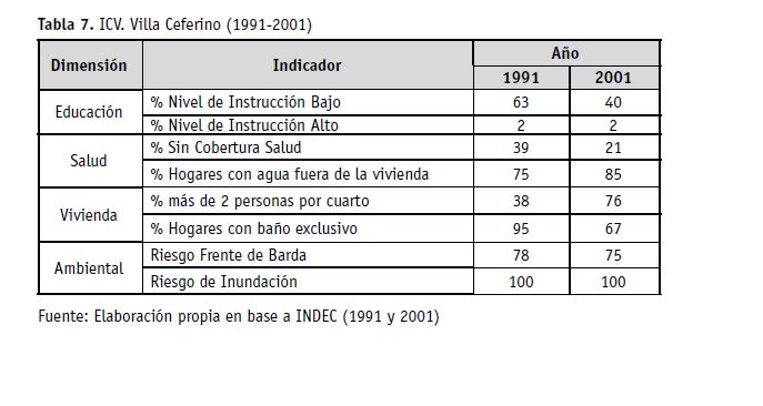 Este panorama se mantiene hacia comienzos de la década de 1990. En un trabajo previo, cuando espacializamos la pobreza a partir de la información suministrada por el Censo Nacional de 1991, advertimos un importante grado de concentración de las unidades espaciales que presentaban una mayor proporción de la población con necesidades básicas insatisfechas (Perren, 2016: 129). La mayoría de ellas conformaba un agrupamiento de radios censales cuyos límites coincidían con Villa Ceferino: dos terceras partes de quienes residían allí estaban expuestos a problemas habitacionales o bien mostraban un bajo nivel de instrucción (Perren, 2016: 129).