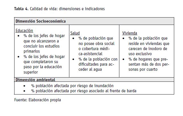 Si en la primera sección observamos a la ciudad como unidad de análisis, en la presente usaremos un lente más potente a fin de aproximarnos a la división social del espacio en la capital neuquina. Una buena forma de hacerlo es utilizando la calidad de vida como herramienta heurística. Sin ánimos de exhaustividad, podríamos definirla como “una medida de logro respecto de un nivel establecido como óptimo teniendo en cuenta dimensiones socioeconómicas y ambientales dependientes de la escala de valores prevaleciente en la sociedad” (Velázquez, 2001, 15). Para el caso de Neuquén, y tomando en consideración nuestra producción previa2, prestamos atención a indicadores de corte educativo, sanitario y habitacional, pero también a dos variables que hacen referencia a lo que los especialistas denominan “riesgo natural” (Celemín, 2007:84). Para una aglomeración emplazada en un valle fluvial esa mayor probabilidad de sufrir el impacto de procesos naturales está dada por residir en las cercanías de los ríos (amenaza de inundación) o en el frente de la barda (amenaza de aluvión). El punto de llegada de este ejercicio puede observarse en la Tabla 4.