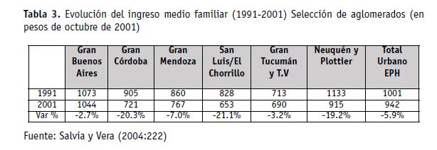 En vistas de este avance acelerado de la desocupación y de la precariedad laboral, no resulta sorprendente que la pobreza haya aumentado, dada la alta correlación entre estas variables. Con todo, y pese a ir de la mano, el caso neuquino presenta algunas particularidades que dan cuenta de su complejidad. En los noventa, la inercia de las políticas de bienestar, sobre todo las relacionadas con la vivienda y la educación, dificultó el despegue de la proporción de hogares con necesidades básicas insatisfechas (NBI); es decir, de aquellas unidades censales que exhibían situaciones de insuficiencia en variables relacionadas con la calidad de la vivienda, disponibilidad de servicios sanitarios, accesibilidad a la educación y ocupación del jefe de hogar. Por el contrario, la tendencia que sí se refleja significativamente es la caída del ingreso real medio familiar. Según las estimaciones a partir de datos oficiales, ese descenso fue del orden del 19,2%, es decir que los 1133 pesos de 1991 se convirtieron en 915 en 2001 (Salvia y Vera, 2004) (Véase Tabla 3). Este declive no fue homogéneo, sino que afectó con particular fuerza a quienes ocupaban una posición baja en la estructura social: el quintil de menores ingresos perdió, a lo largo de la década de 1990, un tercio de su capacidad adquisitiva. Por lo tanto, es posible afirmar que con la “gran transformación neoliberal”, los pobres neuquinos se volvieron aún más pobres (Tabla 3).