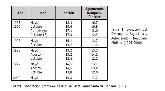 Los cambios promovidos a causa de la “gran transformación” también alcanzaron, como no podía ser de otro modo, a la ciudad de Neuquén. Con un Estado provincial desfinanciado y un conjunto de empresas públicas en retirada, la capital provincial experimentó una “epidemia de desempleo” (Kessler, 1997) que puso fin a los altos índices de ocupación que había operado como un imán para la inmigración en el pasado. De acuerdo a datos oficiales, la desocupación promedio de la ciudad prácticamente se duplicó entre 1991 y 1995: pasó de un 8% en 1990 a cerca de un 16% (Taranda y García, 2001: p. 11). En la segunda parte de la década, los niveles tendieron a estabilizarse oscilando en una franja comprendida entre 11% y 12%, aunque esto no respondió a la creación de empleo, sino a la puesta en vigencia de un plan de subsidios para los desocupados. Finalmente, en el marco de la crisis económica nacional que dominó el corto periodo de gobierno de la Alianza, recrudeció la problemática del desempleo, alcanzando una cifra record para la capital neuquina: en el año 2002, la quinta parte de la población económicamente activa no tenía empleo y lo buscaba sin éxito (Taranda, 2005: p5) (Tabla 1).