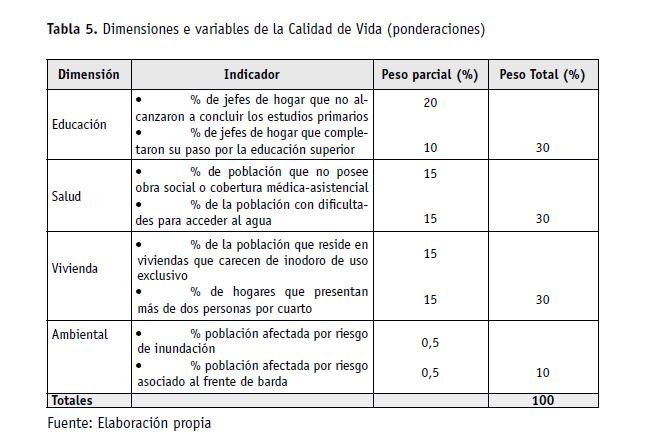 Con el propósito de apreciar la calidad de vida en la ciudad de Neuquén, debimos condensar en un índice sintético la información para cada una de las variables seleccionadas. Con ese propósito, primero estandarizamos las variables y, luego, asignamos un peso a cada variable con relación a las demás (Leva, 2005: 72). En el presente estudio, y tomando en consideración la abundante literatura disponible (Mesaros y Velázquez, 2015), haremos propia una fórmula que asigna un 90% del peso explicativo a las variables que incluimos en la dimensión socioeconómica y el 10% restante a la dimensión ambiental, aunque al interior de cada una de ellas la distribución entre los indicadores no sea precisamente igualitaria. En la Tabla 5 se muestra cuáles fueron las ponderaciones utilizadas para construir los índices, expresadas en porcentajes. Finalmente, el índice de calidad de vida (ICV) deriva de la sumatoria de los valores índice de cada variable, ponderados de acuerdo al peso relativo estipulado. El resultado final del procedimiento es un valor teórico que oscila en un rango comprendido entre 0 (baja calidad de vida) y 100 (alta calidad de vida) (Tabla 5).
