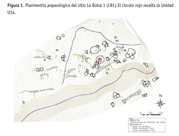 El sitio La Bolsa 1 (LB1) se ubica en el sector norte del Valle de Tafí (Tucumán) y abarca unas 50 hectáreas, en las que se encuentran distribuidas unidades residenciales, corrales, áreas de molienda extramuros, un complejo sistema de estructuras agrícolas (Franco Salvi et al. 2014) y el cual forma parte de un conjunto de ocupaciones que configuraron el paisaje aldeano del primer milenio en el valle y áreas circundantes. Estas primeras aldeas, articularon a un conjunto de poblaciones bastante densas, pero relativamente dispersas en el paisaje, que desarrollaron estructuras políticas marcadas por la fragmentación y la autonomía en la toma de decisiones (Salazar y Kuijt, 2016).
