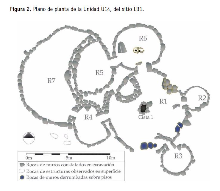 Para este trabajo se ha considerado el registro cerámico de la unidad 14 (U14) en el sector central de LB1, donde se encuentra la mayor concentración y diversidad de estructuras, las residencias se vinculan con parcelas de cultivo – formadas por cuadros, canchones y campos aterrazados-. El sector medio e inferior está conformado casi exclusivamente por estructuras de producción agrícola, entre las cuales se destacan un canal para el manejo del agua, aterrazamientos, montículos de despedre, muros de contención del suelo y áreas de molienda extramuros. Finalmente, en las cotas superiores, se observan grandes recintos circulares o subcirculares