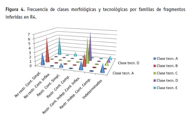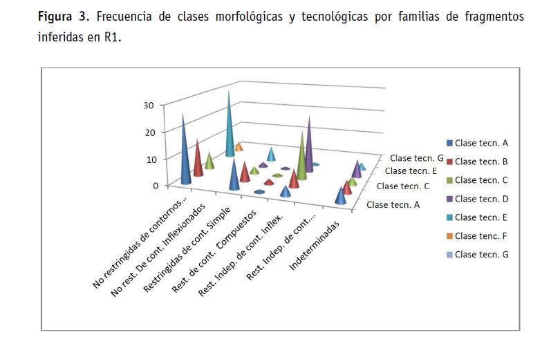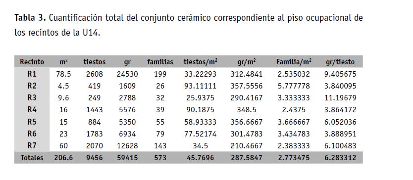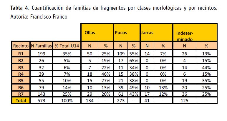 Del análisis y cuantificación del conjunto de fragmentos (N=9456) recuperados en los estratos del piso ocupacional de la U14, se infirieron 573 familias (Tabla 3) distribuidas de manera diferencial en siete recintos.