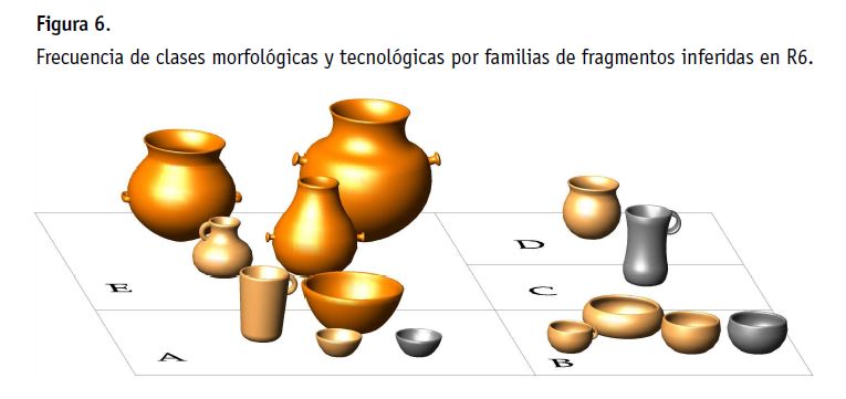 A partir de los 1443 tiestos recuperados se infirieron 39 familias de fragmentos (Figura 4). Se observa una importante presencia de ollas globulares y sub-globulares, grandes (46%, n=10) y pequeñas (n=8), predominantemente de clase tecnológica D (n=7) y C (n=6), muchas de ellas con rastros de hollín. En segundo lugar se identificaron, 15 pucos (38%), de los cuales 13 presentan formas no restringidas de contornos simples y 2 siluetas restringidas. Estos se corresponden con las clases tecnológicas A y B (n=9), y E (n=6). Se observa una tendencia hacia los tamaños pequeños de los mismos (n=11).