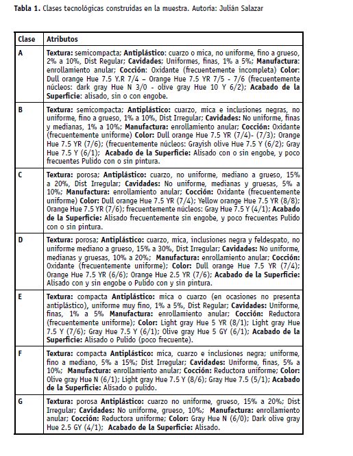 A partir de los atributos de pastas relevados se identificaron 47 estándares como archivo de base, con los cuales se establecieron 6 clases tecnológicas distintas que manifiestan una variedad de conductas en relación a la elección de materias primas y elaboración de las pastas (Tabla 1).