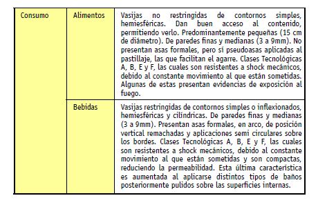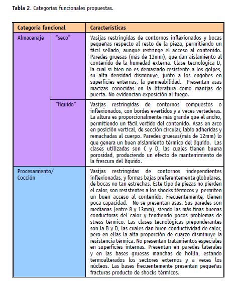 La cuantiosa información provista por trabajos etnoarqueológicos, arqueológicos y experimentales (Blitz, 1993; Henrickson y McDonald, 1983; Hally, 1986; Menacho 2001 y 2007, Tite et al. 2001) permiten plantear la existencia en el conjunto analizado de cinco categorías funcionales hipotéticas (Tabla 2): a) almacenaje de líquidos, b) almacenaje “seco”, c) procesamiento/cocción, d) consumo de alimentos y e) consumo de bebidas.