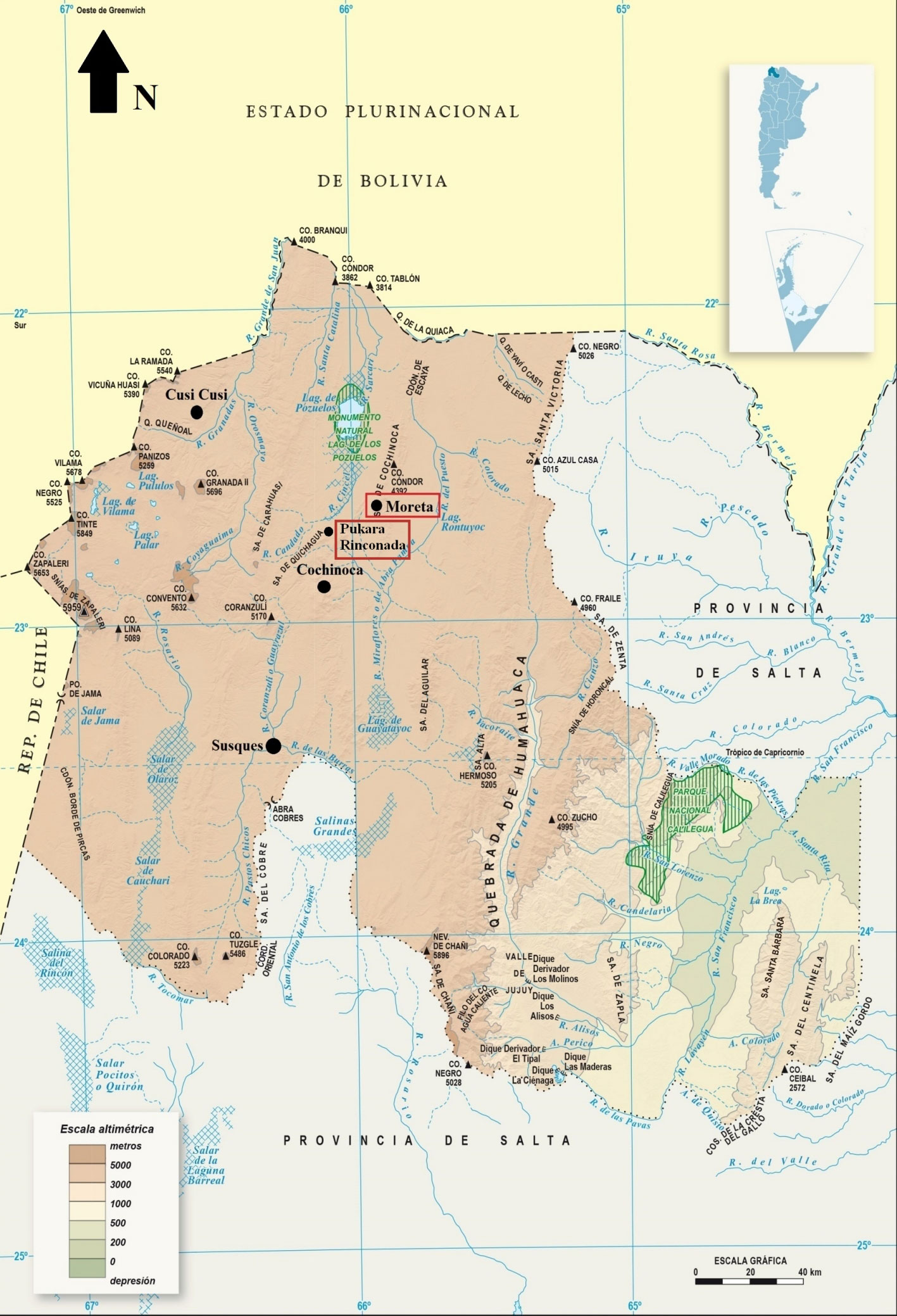 Características ambientales del área de estudio El sector de la puna de Jujuy, donde se ubica Moreta, se caracteriza por un déficit hídrico durante la mayor parte del año, irregularidad en las precipitaciones, humedad atmosférica muy baja, elevada radiación solar, temperaturas nocturnas inferiores a 0°C durante todo el año, gran amplitud térmica y abundancia de sales. Pertenece a la provincia fitogeográfica Puneña, que se extiende por las altas montañas y mesetas del noroeste y oeste de Argentina, desde el límite con Bolivia hasta el norte de la provincia de Mendoza. En el sector septentrional, donde se encuentra el sitio en estudio, es donde la provincia Puneña presenta alturas más elevadas, de entre 3400 y 4500 msnm (Cabrera, 1976).