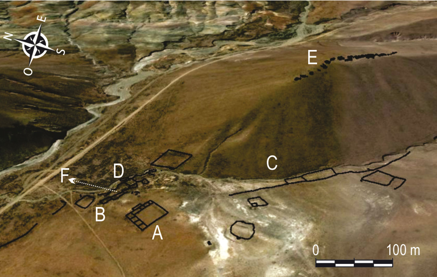Moreta es un poblado conformado por estructuras de funcionalidad y antigüedad variadas, dividido en dos partes por un curso de agua temporario que ha erosionado algunas de las construcciones antiguas. De un lado del arroyo se observa un Recinto Perimetral Compuesto (RPC) incaico de gran tamaño (Figura 2.A), emplazado a unos 50 m de una serie de terrazas que horizontalizan un sector de leve pendiente (Figura 2.B). Hacia el sudeste se conservan seis grandes corrales, algunos de ellos con refugios adosados (Figura 2.C). Del otro lado del curso de agua temporario, hacia el norte, se encuentra un sector residencial que ocupa aproximadamente 1,5 ha (Figura 2.D), compuesto fundamentalmente por recintos de planta rectangular dispuestos en torno a patios de planta cuadrangular, características similares a las de la arquitectura chicha del curso medio del Río Grande de San Juan (Nielsen et al., 2015). Inmediatamente al este, en la cima de una loma que se eleva unos 120 m por sobre la altura del poblado, se construyó un sector defensivo al que hemos denominado Pukara de Moreta (Figura 2.E). Hacia el sudoeste se extiende un área ocupada por diversas estructuras de cultivo (andenes, terrazas, melgas), que cubren una superficie de unas 150 ha, atribuidas en parte a momentos incaicos por su escala, diseño y factura. Se emplazan junto al Qhapaq Ñan, que atraviesa Pozuelos de norte a sur por el fondo de la cuenca (Angiorama et al., 2017).