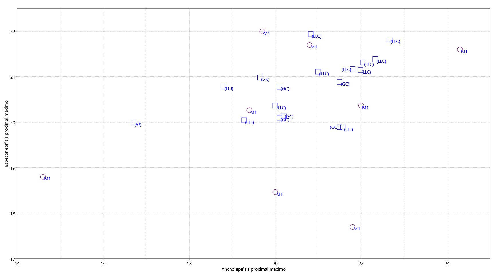 En el caso de los materiales identificados como Camelidae, a fin de diferenciar especies silvestres y domésticas se realizó la comparación de los restos con material de referencia de individuos adultos: esqueletos de una llama y un guanaco de los Valles Calchaquíes (Tucumán), y huesos axiales y apendiculares aislados de vicuñas procedentes de Susques (Jujuy). Asimismo, se tuvo en cuenta la secuencia de tamaño corporal para los camélidos andinos, de mayor a menor porte: llama, guanaco, alpaca, vicuña, y lo señalado en Mercolli et al. (2018) respecto a que existe, además, una llama de mediano tamaño que es muy similar al porte del guanaco. Para el análisis osteométrico de la primera falange se tomaron mediciones con un Calibre Metálico 0-150 Mm + Micrómetro Mecánico 0/25 Mm, se usaron las dimensiones utilizadas en diversas publicaciones (Kent, 1982; Izeta, 2008, 2010; Izeta et al., 2012), y de acuerdo a los parámetros establecidos en Izeta et al. (2009). Las medidas usadas son: 1- Largo total; 2- Ancho epífisis proximal; 3- Espesor epífisis proximal; 4- Ancho epífisis distal; 5- Espesor epífisis distal. Los datos se sometieron a análisis multivariados mediante el programa PAST 2.12 (PAleontological STatistics) (Hammer et al., 2001; Hammer y Harper, 2006). En este análisis se incluyeron los datos de las falanges arqueológicas del sitio en estudio y como medidas de referencia se tomaron los de falanges de llamas, guanacos y vicuñas actuales del Noroeste Argentino (Jujuy, Salta, Catamarca), publicadas en Izeta et al. (2009:172-174). Todas los ejemplares usados y las medidas fueron incluidas en la Tabla 3, en coincidencia con el planteo en Gasco et al. (2014) respecto de la gran importancia de contar con dimensiones que aporten a los bancos de datos comparativos actuales y arqueológicos de las falanges de camélidos andinos.