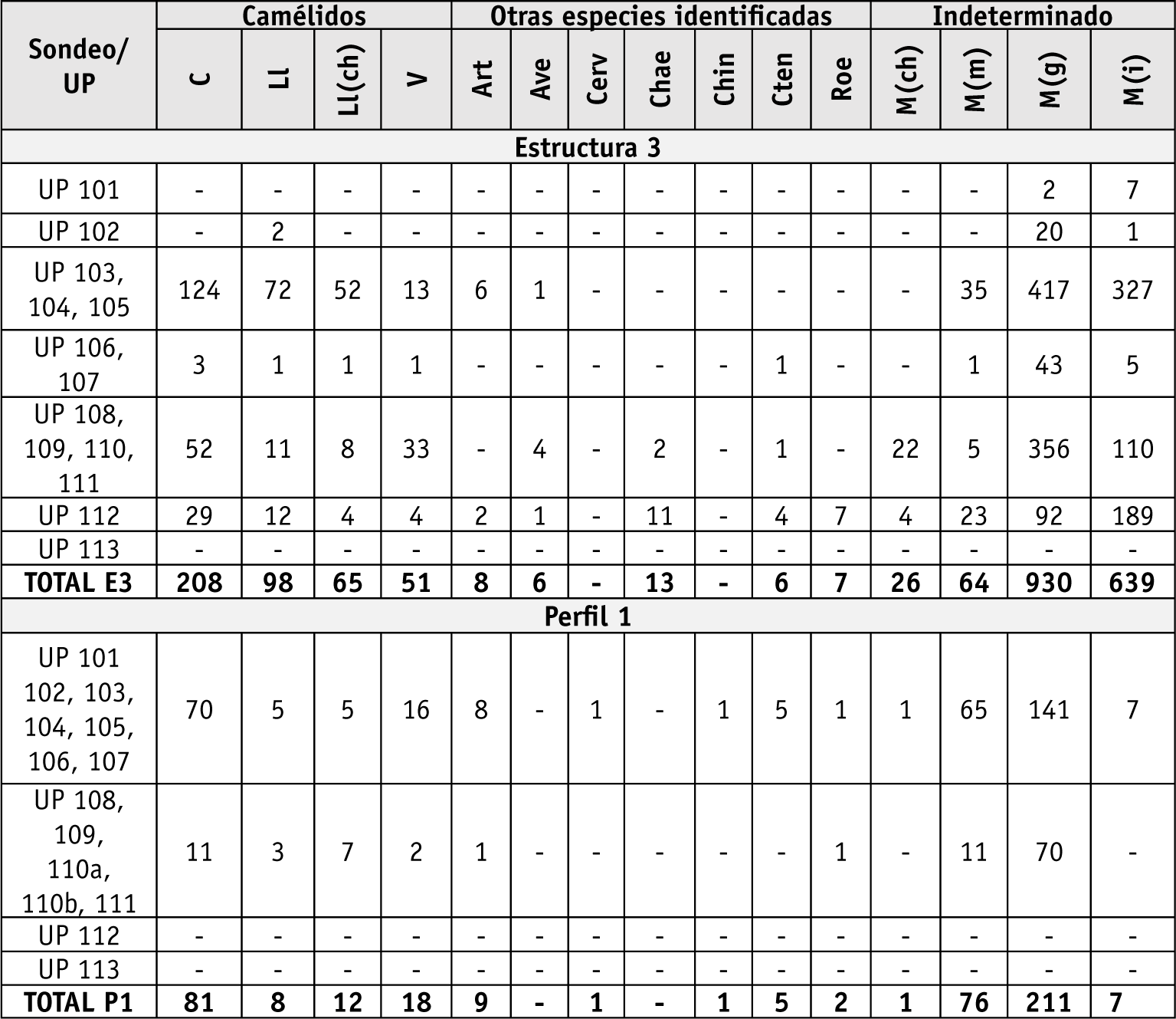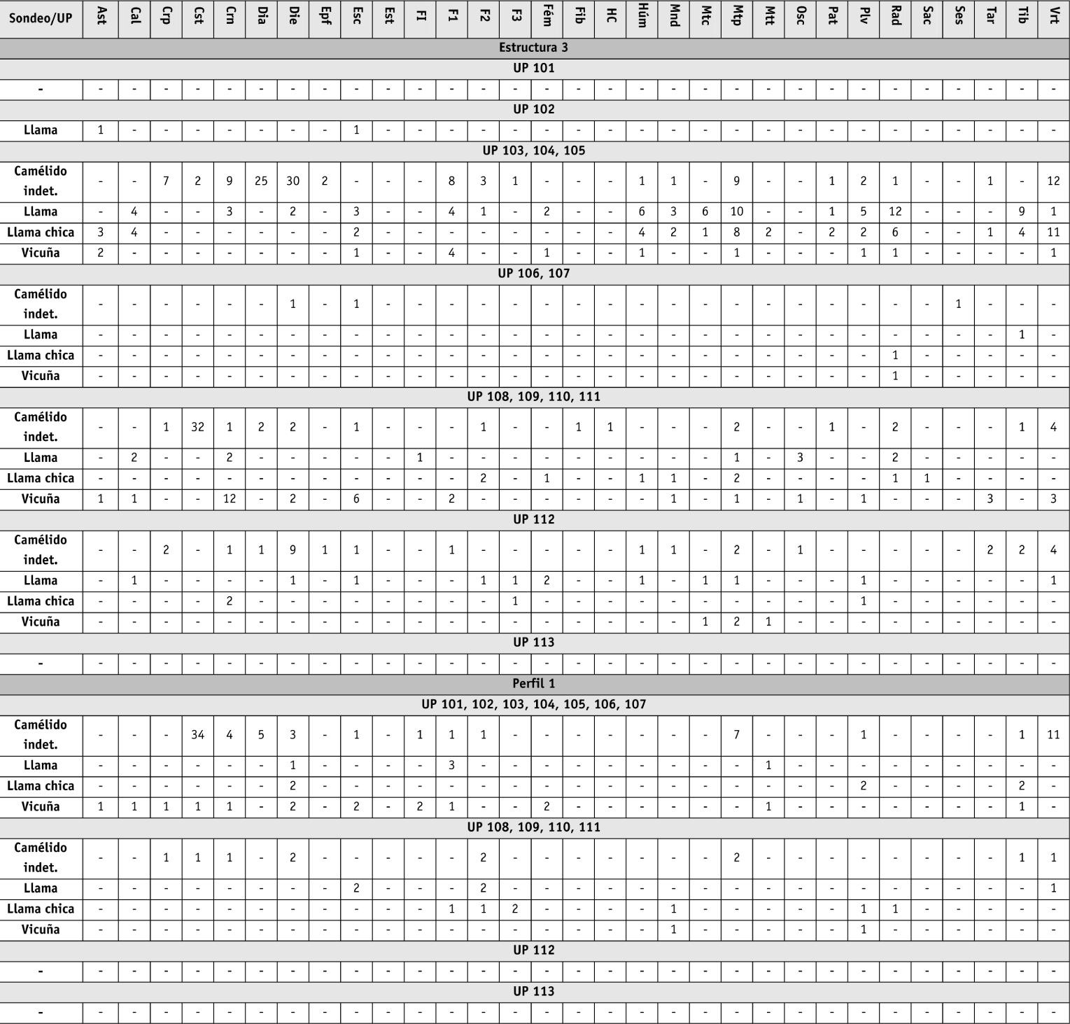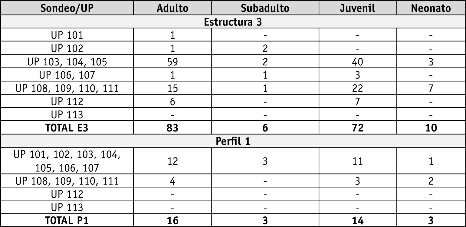 Tanto en la muestra recuperada en la Estructura 3 como en la del Perfil 1 se observa la presencia de restos óseos asignables a vicuñas a lo largo de casi toda la secuencia. Sin embargo, es destacable que en la secuencia de depositación más moderna del Perfil 1 (UP 101-107) y en el sedimento acumulado luego del abandono del piso más antiguo de la Estructura 3 (UP 108 y 109) (Tabla 1), contemporáneos entre sí de acuerdo con los fechados radiocarbónicos (1000-1150 d.C. aproximadamente), los restos asignables a camélidos silvestres predominan respecto a los correspondientes a llamas (Tabla 2). Esta situación se invierte notablemente en los niveles más modernos de la Estructura 3 (UP 103-105).