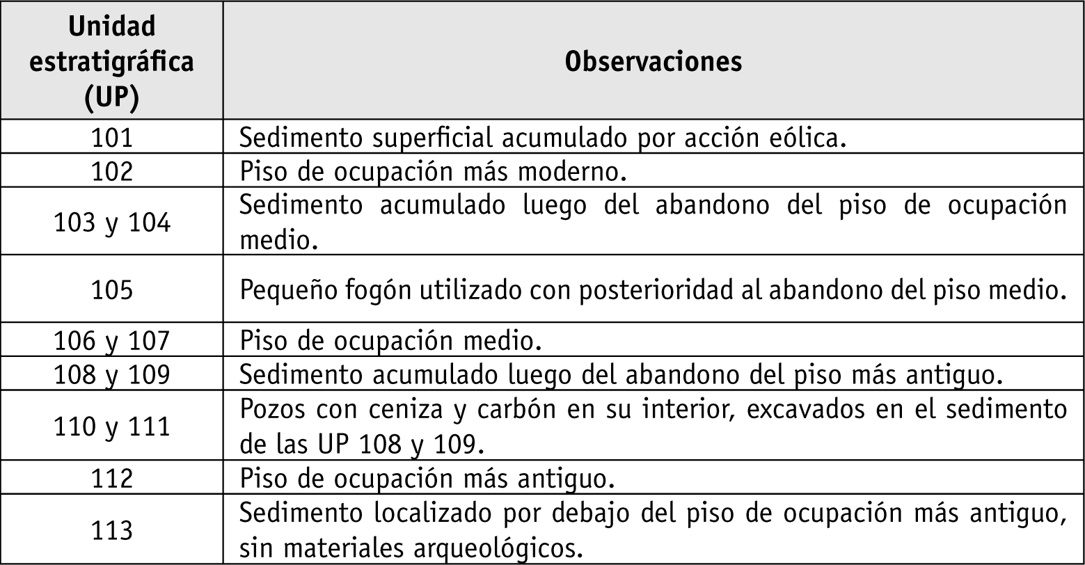 Se obtuvieron dos dataciones radiocarbónicas para este sondeo. Una, correspondiente al piso de ocupación más moderno (UP 102), dio un resultado de 1020±70 AP (1017-1151 cal d.C.1, 1 sigma). La otra, obtenida en una unidad estratigráfica que se extiende por debajo del piso medio (UP 108), pero que no corresponde al piso inferior, dio un resultado de 1060±80 AP (970-1148 cal d.C., 1 sigma). Se hallaron materiales arqueológicos en cada uno de los pisos de ocupación y en los sedimentos depositados luego del abandono de cada uno de ellos.