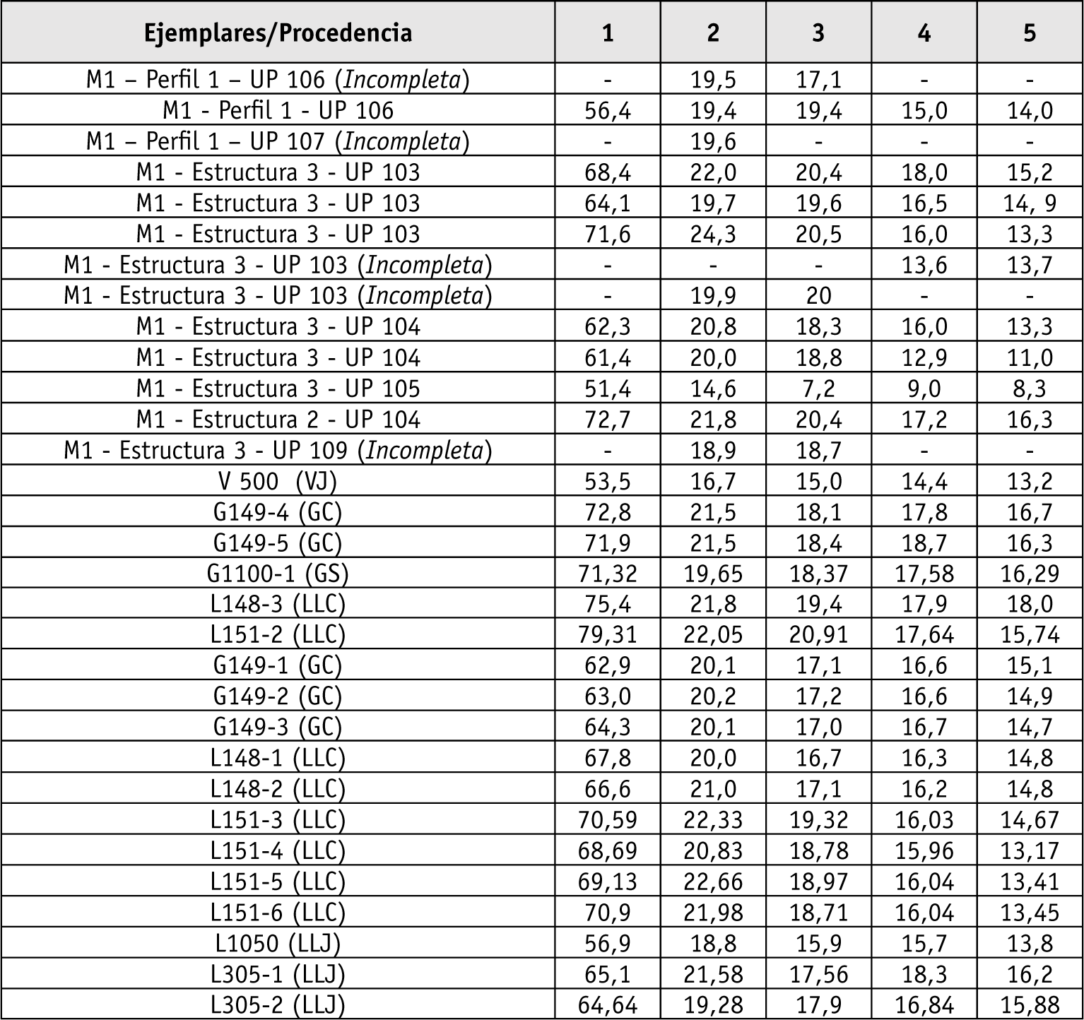 Se debe destacar que, sobre el piso de ocupación medio, en las UP 106 y 107, se hallaron muy escasos restos arqueofaunísticos, lo que dificulta efectuar comparaciones con los niveles más antiguos. En cambio el sedimento depositado luego del abandono, UP 103, 104 y 105, presenta la mayor cantidad de huesos de fauna. La muestra de estas últimas UP contiene 261 restos óseos atribuibles a camélidos, de los cuales el 52,5% fue identificado a nivel de especie, correspondiendo el 47,5% a camélidos domesticados (3 neonatos, 6 juveniles y 36 adultos) y el 5% a silvestres. En este nivel fueron recuperadas varias de las falanges completas que pudieron ser medidas (Tabla 3), y se observan numerosos huesos fracturados (probablemente para extracción de médula), 1 hueso formatizado y varios huesos termoalterados. Por otra parte, una cantidad importante del conjunto presenta alteraciones no antrópicas, tales como indicios de pisoteo, agrietamiento, marcas de carroñeo y signos de arrastre por agentes naturales. También se hallaron un hueso de ave posiblemente acuática y 6 huesos identificados al nivel taxonómico de artiodáctilo y que, podrían ser corresponder a camélido o a cérvido.