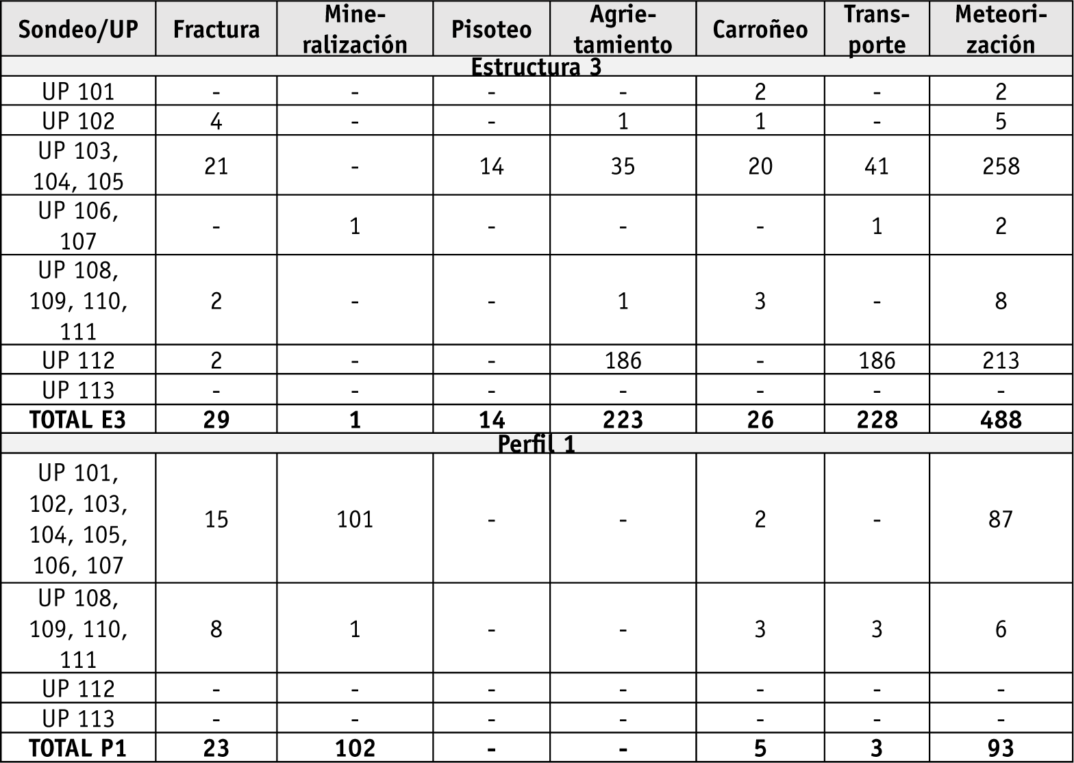 Análisis de resultados por contextos de excavación y unidades estratigráficas (UP)