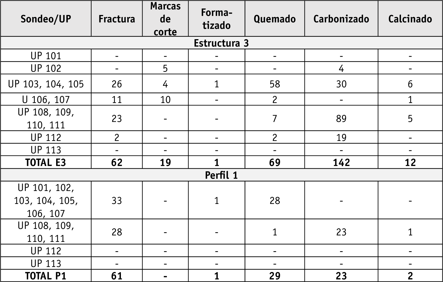 Las características tafonómicas de la muestra en general, que consiste principalmente en mamíferos grandes, dan cuenta de un buen estado de conservación a pesar de su alto grado de fragmentación. Se observan, en parte de la muestra, rasgos que permiten interpretar la acción de procesos naturales ocurridos en un sustrato húmedo, principalmente la adherencia del sedimento calcáreo en parte de la superficie de los huesos y manchas oscuras en los mismos (que pueden corresponder a impregnación de minerales). La alta fragmentación y la cantidad de rasgos de alteración térmica en los restos, por otro lado, son indicios de que fueron descartados tras su consumo. Varios huesos presentan evidencias de cortes realizados con filos, ya sea para separar tendones, extremidades o el cráneo del resto del cuerpo. Además, se observan otros indicios de procesamiento, como golpes para extracción de la médula, y se registran dos elementos formatizados (uno en el Perfil 1 y otro en la Estructura 3), a los cuales es dificultoso atribuirle funcionalidad dado su estado fragmentario, siendo éste otro indicador de que la muestra analizada es producto principalmente del descarte.