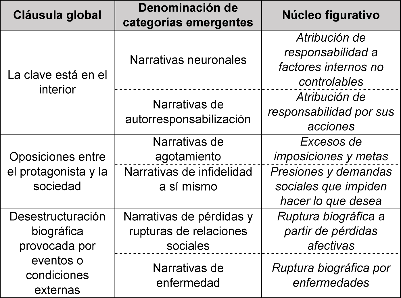 El análisis de las entrevistas biográficas se basó en la construcción de categorías de segundo grado con el fin de presentar conceptualmente las diferencias y similitudes de los relatos de vida. El trabajo analítico consistió en examinar una multiplicidad de formas de contar sobre el origen de la depresión en base a una polaridad conceptual centrada en fuerzas o factores más internos, por un lado, y más externas, sociales u extrínsecas, por otro. Se elaboró una categoría de narrativa toda vez que se evidenció una idea sustantiva acerca del comienzo de la depresión. Estos constructos conceptuales permiten agrupar los relatos biográficos en torno a nociones compartidas acerca del origen de las depresiones pero no pretenden ser categorías herméticas. Estos tipos de narrativas muestran los modos en que las personas en diversos contextos están habilitadas y tienen competencia para recurrir a recursos narrativos disponibles y válidos en esos espacios (Frank, 2012).