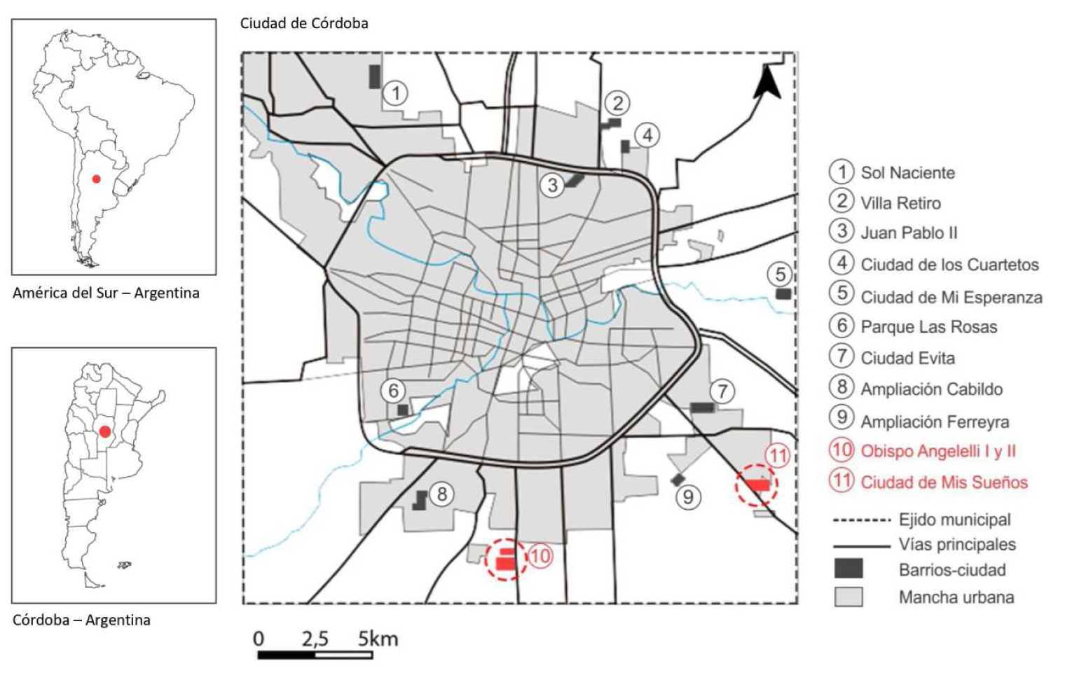 Los casos de estudio: barrios-ciudad Obispo Angelelli (OA) y Ciudad de Mis Sueños (CDMS), se ubican en la periferia sur y sureste respectivamente. Están localizados por fuera de la avenida de Circunvalación, es decir periféricos, pero con diferentes niveles de consolidación e inserción en la estructura urbana, en términos del acceso a oportunidades de servicios y recursos sociales urbanos (Fig.1).