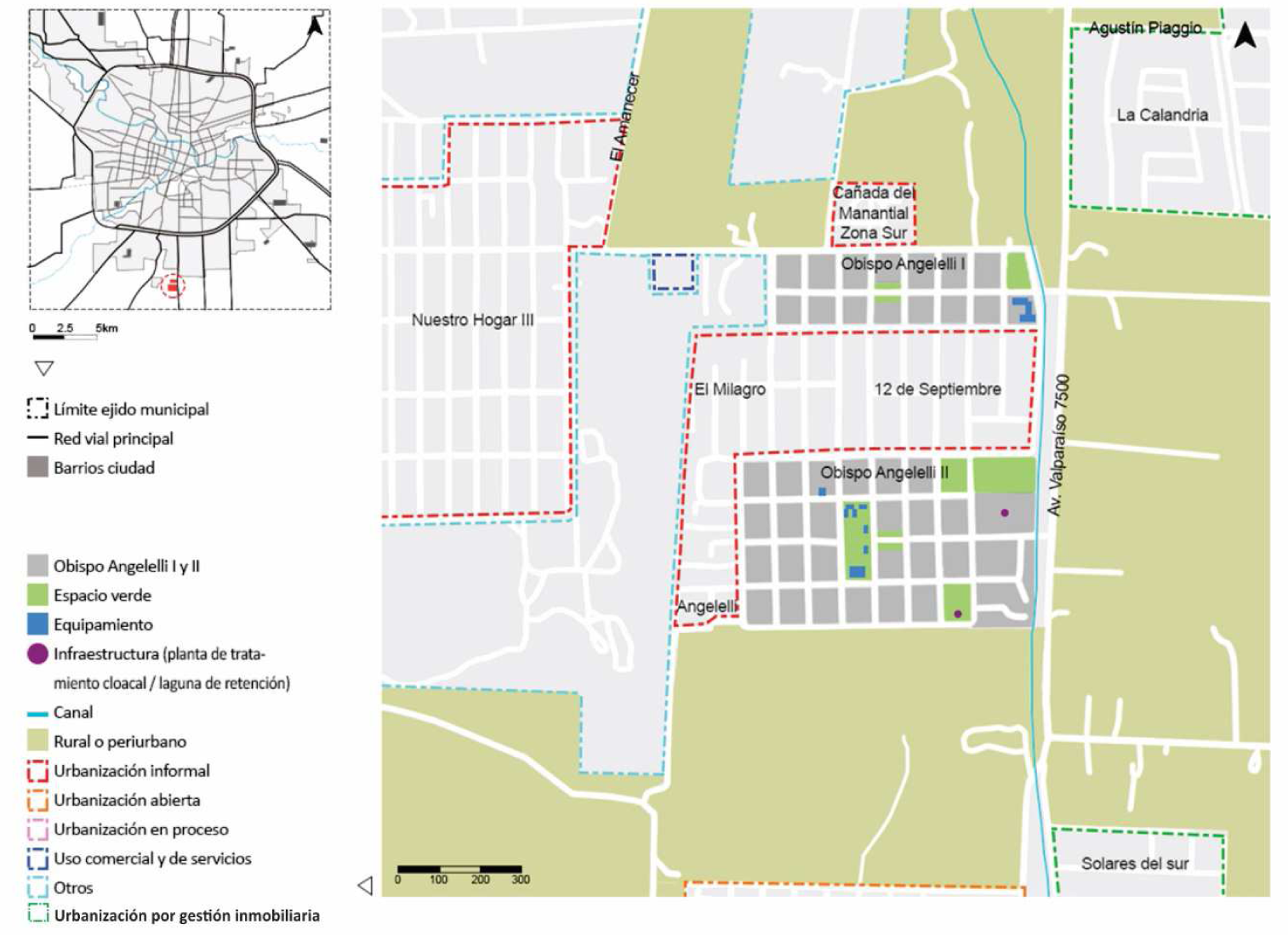 Elaboración propia en software QGIS, a partir de datos del Gobierno de la Provincia de Córdoba (2010).El barrio Ciudad Obispo Angelelli, se localiza en la periferia sur, en un entorno periurbano con predominio de usos industriales, rurales, asentamientos informales y urbanizaciones cerradas (Fig.2). Se inauguró en el año 2007, con 564 viviendas, organizadas en dos sectores: Angelelli I y II. En el primer sector, se relocalizaron familias de la villa Obispo Angelelli, ubicada a escasa distancia del nuevo barrio; y el segundo sector, estuvo dirigido a población de otras villas de áreas centrales y pericentrales de la ciudad (fueron relocalizadas a este barrio familias de las siguientes villas: Villa Mirizzi, Villa Libertador anexo, Costa Canal Sur, Carbó, Cortaderos Sur, La Cascada; y socios de la organización Villa de Fátima).
