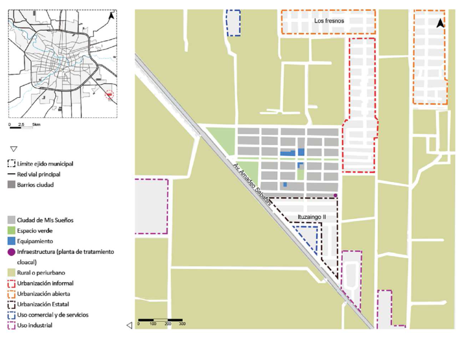En Ciudad de Mis Sueños se construyeron 565 viviendas adjudicadas en el año 2004, destinadas a hogares de 16 villas3. Se localiza en la periferia sureste, en un contexto rural industrial y con escasas urbanizaciones próximas que se presentan desarticuladas en la trama urbana. En algunos casos se trata también de vivienda social construida en décadas anteriores (Barrio Ituzaingó I y II), y en el último tiempo se han desarrollado urbanizaciones informales (Los Fresnos e Ituzaingó II Anexo). La consolidación del entorno urbano desde 2004 a la actualidad da cuenta de una leve transformación (10%), que sigue expresando la situación aislada del barrio. Lo cual se profundiza por la existencia de una única línea de transporte público que vincula con el centro en 78 minutos de recorrido, y cubre una distancia de 13 km.
