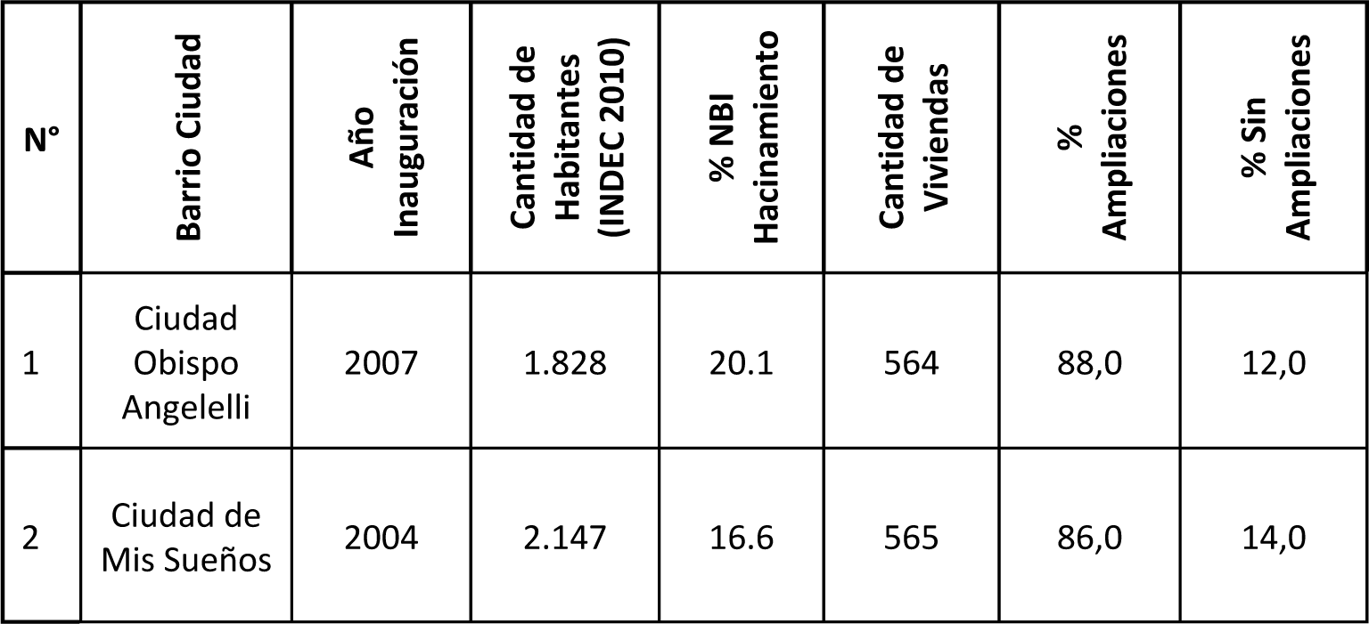 Elaboración propia en software Adobe Illustrator, a partir de datos del Catastro de la Provincia de Córdoba (2022).de déficit habitacional4 (Instituto Nacional de Estadísticas y Censo (INDEC), 2013) (Tabla Nº 1). Ante esta situación los habitantes desarrollaron ampliaciones por autoconstrucción de dormitorios, garajes, espacios de reproducción económica (kioscos, despensas, peluquerías, etc.), e incluso de nuevas unidades habitacionales. La tabla 1, indica el porcentaje de ampliaciones del núcleo inicial (42 m2 cubiertos). Se observa que el caso de Obispo Angelelli alcanza un 88% de viviendas, y un 86% en Ciudad de Mis Sueños.