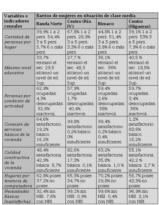 Para determinar la muestra se procedió en un doble sentido atendiendo a dos localidades de estudio del Gran Río Cuarto. Para acordar los barrios típicos de residencia de clase media de la ciudad de Río Cuarto se operó mediante un “método de consenso de informantes claves”2 (Saforcada, 2002, p.224) que permitió escoger los barrios Banda Norte (BN), Bimaco (BB), y Centro (BC). Mientras que, para la localidad de las Higueras se procedió a través de informantes claves que permitieron contactar con mujeres residentes en el barrio centro (BCH) de dicha localidad.