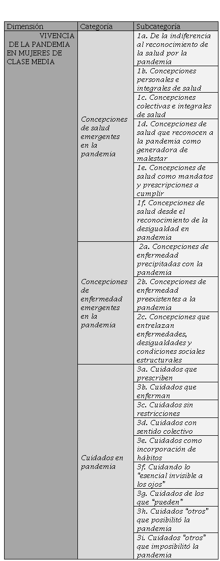 Como resultado se identificó una dimensión de análisis denominada “vivencia de la pandemia en mujeres de clase media” integrada por las categorías concepciones de salud, concepciones de enfermedad y cuidados en pandemia.