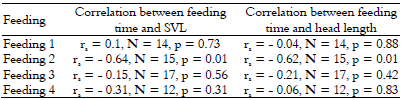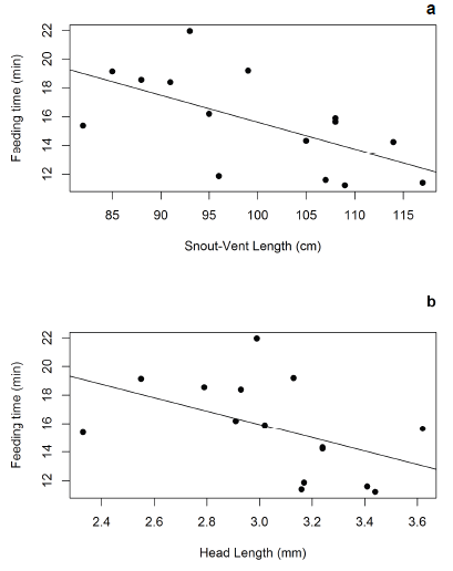 We found negative correlations between feeding time and snake size and between feeding time and head length only in the second round of feedings, corresponding to a multiple prey feeding (Table 1, Figure 1).