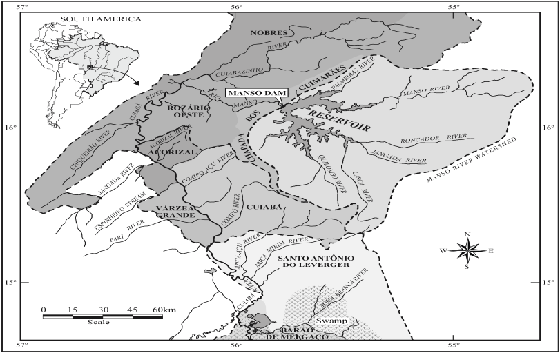 Samples were collected in the river Cuiabá, a tributary of the Paraguay river, Manso river, the main tributary of the Manso Reservoir, Manso Reservoir and its area of influence (immediately above the Mato Grosso Pantanal). The Manso Reservoir (Figure 1) lies in the State of Mato Grosso, at 16°32’ - 16°40’ S and 54°40’- 55°55’ W, near the Chapada dos Guimarães National Park.