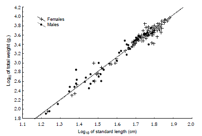 Ancova for the assumption of parallelism was reached (p = 0.54) and indicated that slopes in the relationship between standard length and total weight may be considered equal (Figure 2).