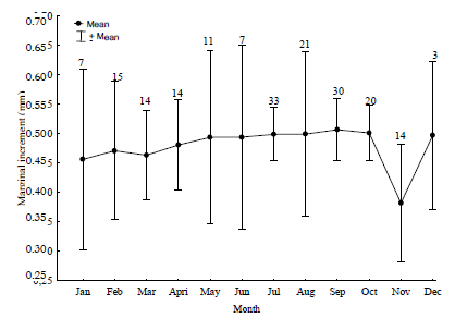 The number of growth rings on the scales was checked with a stereoscopic microscope and an ocular micrometer to obtain the distance between center (focus or nucleus) and anterior margin of scale (radius, mm) and the distance from the center to growth ring (mm). A temporal analysis of the monthly means of the marginal increment was performed to verify the time and frequency of growth rings’ formation for the species (Lai, Han-Lin., Gallucci, Gunderson, & Donnelly, 1996). The following expression was employed: