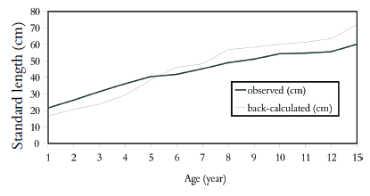 A graphical inspection showed no great differences on back-calculated standard lengths and observed data standard lengths (direct method) (Figure 4). This fact indicated that the Rosa Lee’s phenomenon was not an issue in this study and it was not necessary to exclude any age group to estimate the parameters of von Bertalanffly equation.