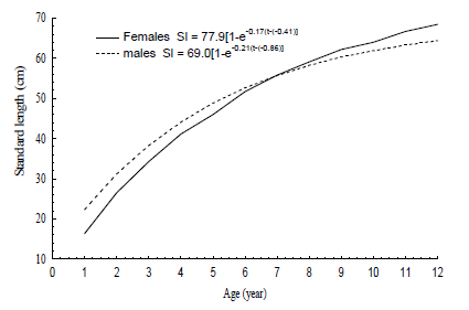 There was no difference between the intercepts (p = 0.32). Moreover, the fact that females achieve asymptotic greater lengths tan males is widely described in the literature (Lowe- McConnell, 1999; Godinho, 2007) and was chosen to estimate the growth parameters for the sexes separately.