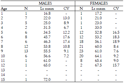 Since the coefficients of variation of the standard mean lengths of fish with the same age class did not exceed 19%, scales proved to be appropriate for studies on age and growth of the species. They resulted in consistent data which may adequately be used to estimate the age, while the parameters of the von Bertalanffy equation did not lead to biased estimates (Witherell & Burnett, 1993).