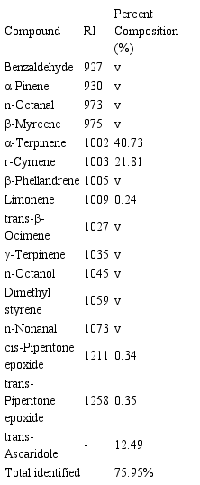 The percentages and retention indices of chemical constituents of the essential oil from C. ambrosioides are presented in Table 1. Monoterpenes hydrocarbons (62.8%) were the most abundant in the oil, while oxygenated monoterpenes were found in concentrations of 13.2%. The principal constituents found were α-terpinene, p-cymene and trans-ascaridole. The remaining components identified were found in percentages ≤0.5% (Santiago et al., 2014).
