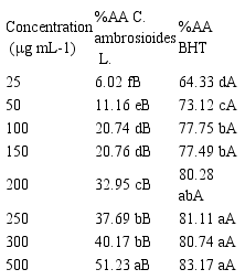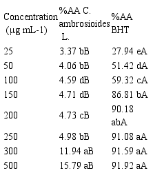 Miranda, Cardoso, Batista, Rodrigues, & Figueiredo (2016) evaluated the antioxidant properties of essential oils of fresh leaves from Coniza bonariensis, Parthenium hysterophorus, Tithonia diversifolia, Ambrosia polystachya, Hedychium coronarium and Baccharis dracunculifolia, extracted by hydrodistillation. It was observed essential oils from C. bonariensis, B. dracunculifolia and A. polystachya are rich in monoterpenes hydrocarbons compounds, with percentage of 86.6, 58.2 and 32.7%. Using β-carotene/linoleic acid methodology, these oils showed IC50 greater than the highest concentration evaluated, but, none of the essential oils assessed by DPPH radical sequestration presented significant activity.