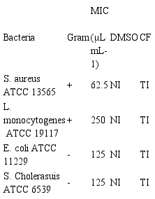 The minimum inhibitory concentrations (MICs) of the essential oil from C. ambrosioides that inhibited the growth of the bacteria under study are listed in Table 4. The essential oil presented antibacterial activity at the concentrations evaluated, inhibiting the growth of Gram-positive and Gram-negative bacteria. The MIC for the bacterium Listeria monocytogenes (Gram-positive) was higher than those observed with the other bacteria. This fact differs from most studies, which report that Gram-positive bacteria are more sensitive to essential oils than the Gram-negative bacteria. In most cases, Gram-negative bacteria are less sensitive that Gram-positive bacteria, because cell wall of Gram-negative is rich in polysaccharides, with inhibits the penetration of antimicrobial substances (Burt, 2004).